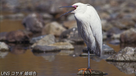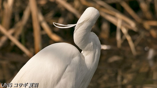 後頭部の飾り羽、胸と背から伸びるレース状の飾り羽は繁殖が終わると抜け落ち冬羽に変わる