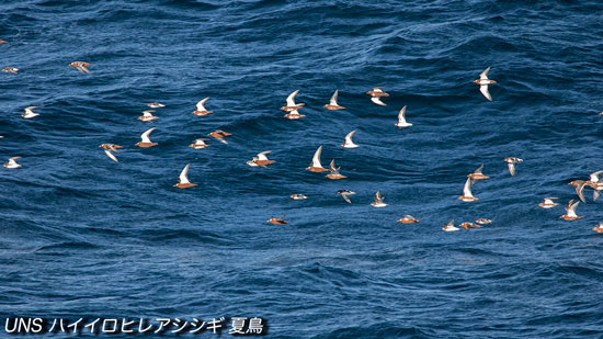 一回り小さいアカエリヒレアシシギも群れに混じる