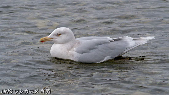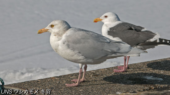 右のオオセグロカモメと比べ上面は薄い灰色、翼先端は白っぽい